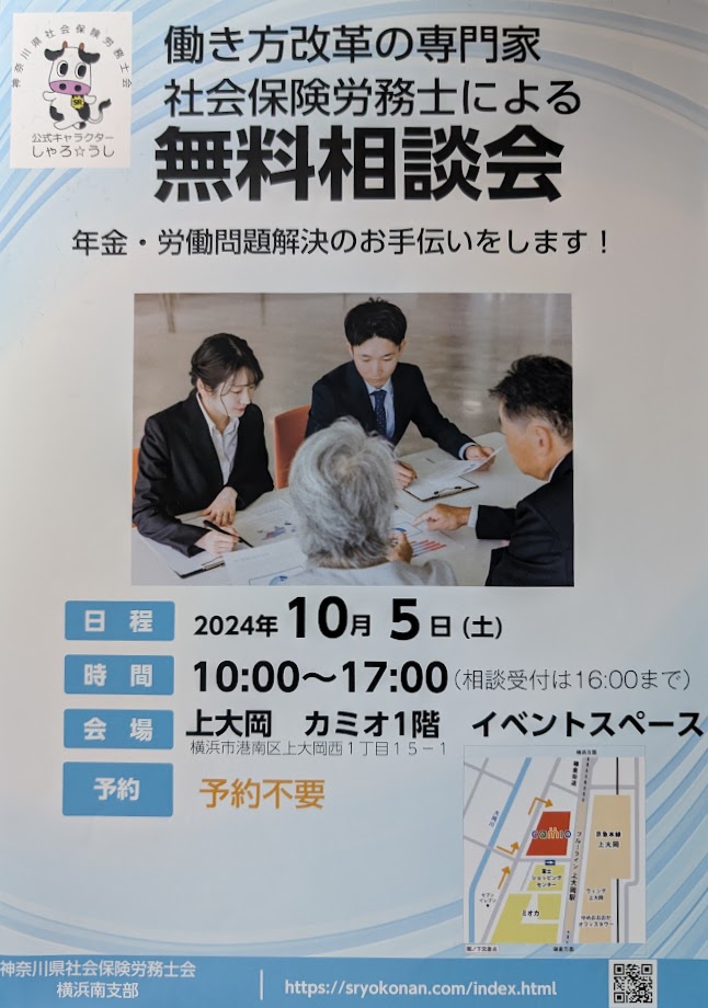 上大岡Camioにて、当方が所属しております神奈川県社会保険労務士会横浜南支部主催の街頭無料相談会が開催されます。